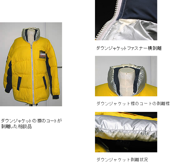 紳士用スキーダウンジャケット(表生地ナイロン100% 裏生地ポリエステル100%(中綿ダウン70% フェザー30%))をクリーニングに出したら、襟のコーティング部分が剥離した。