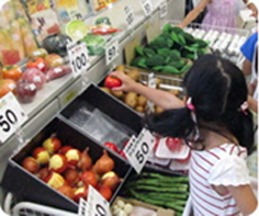 家族と一緒に昼食を作るため、献立に応じて必要な材料を模擬店舗で買う体験を通じ、親子でお金について考えるプログラムです。